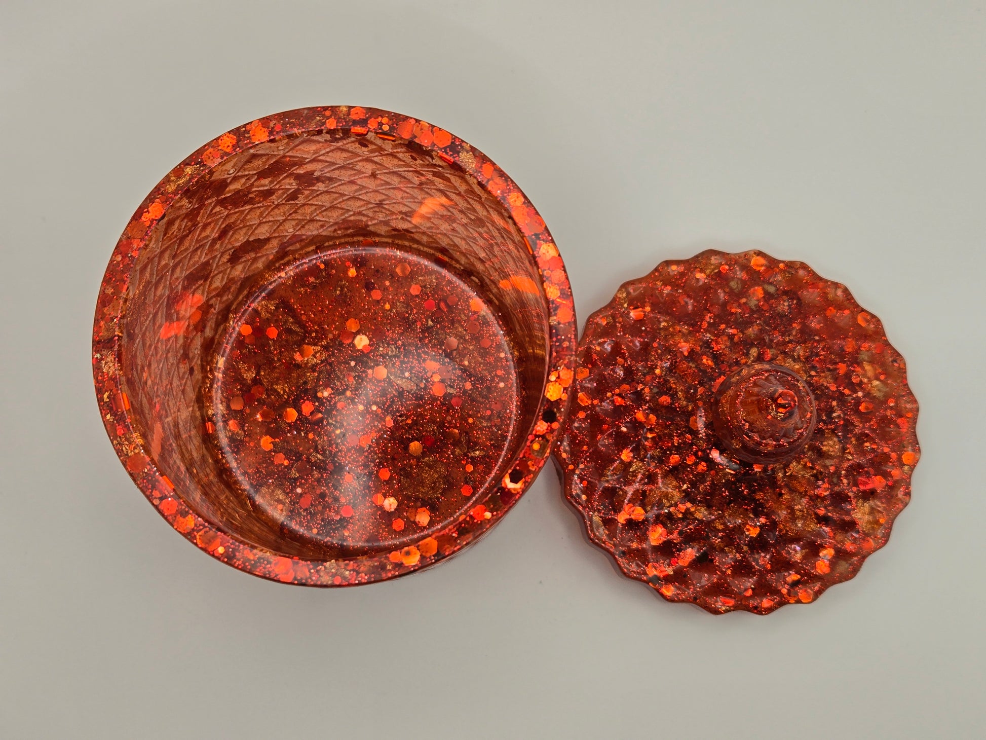Vibrant and full of personality, this bold red resin jar is hand-poured for a luxe, high-shine look. Flecks of copper and gold shimmer bring warmth and movement, making it the perfect accent for gifting, bathroom storage, or brightening your beauty shelf.
